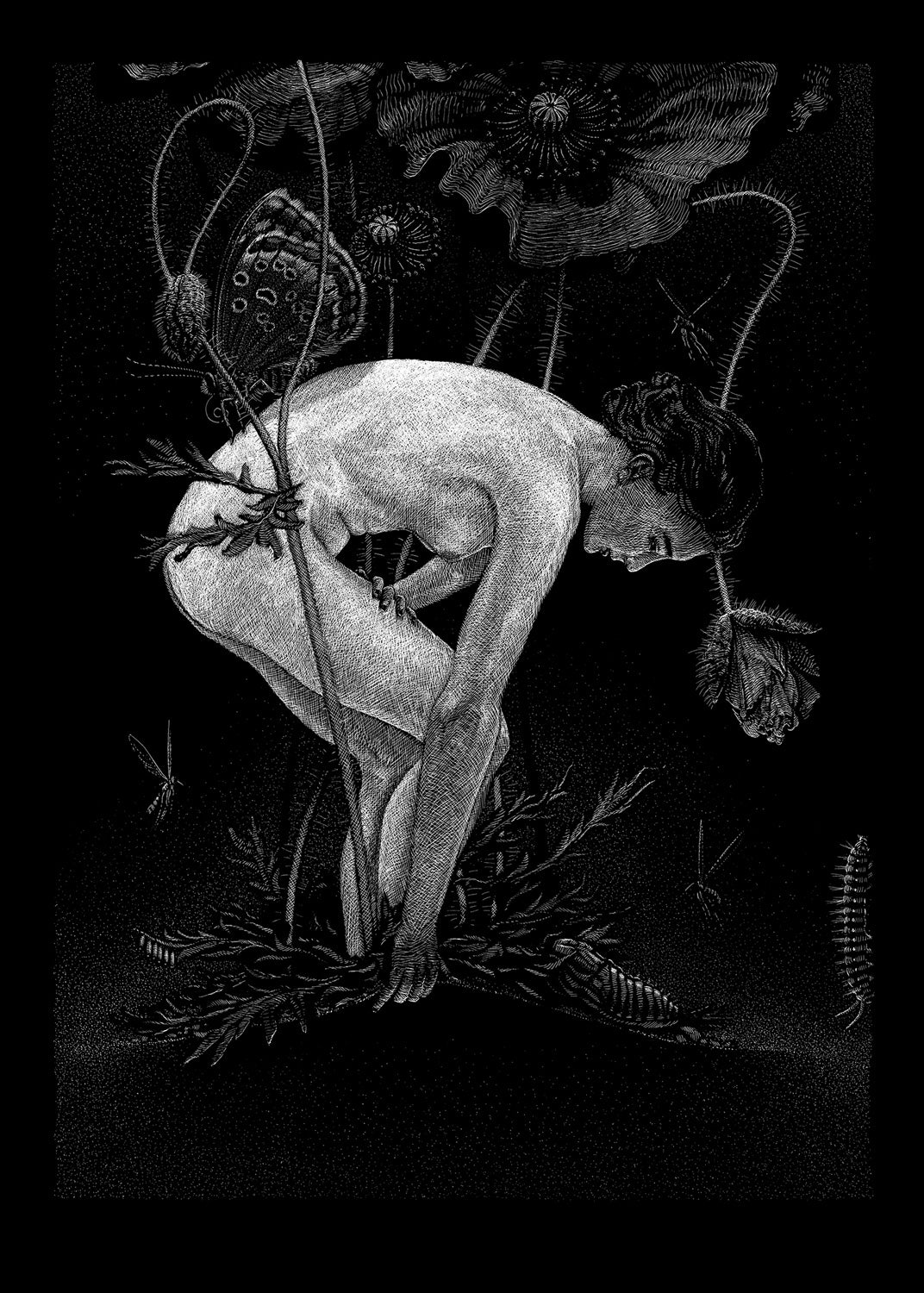 Toutes ses œuvres sont réalisés sur carte à gratter.