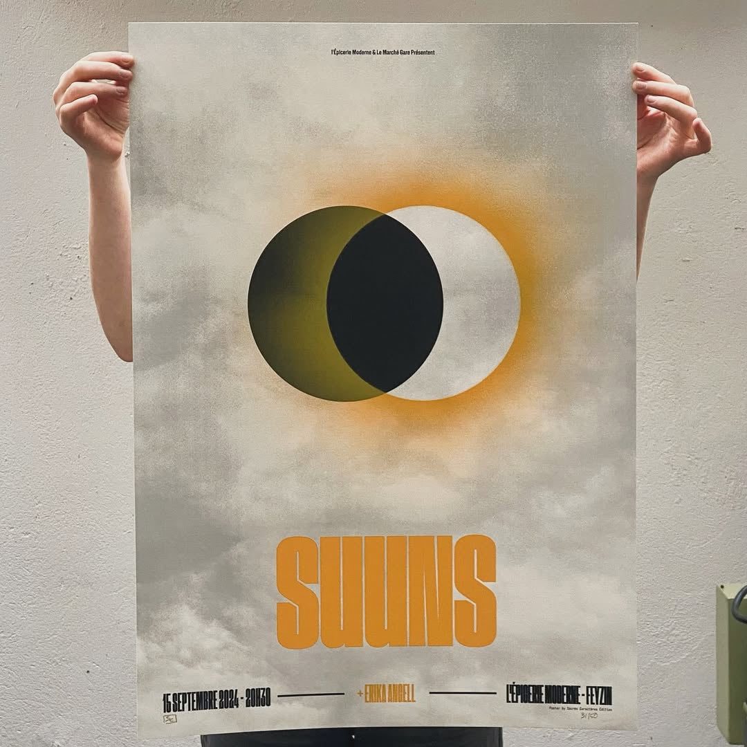 Suuns| Feyzin (Fr) Sérigraphie officielle Concert à l'Épicerie Moderne, 2024 Design de l'artiste Sacrés Caractères (Joël Blanc-Tailleur) Edition numérotée signée de 50 exemplaires Sérigraphie Format 50 x 70 cm Suivez... Voir la description complète du produit