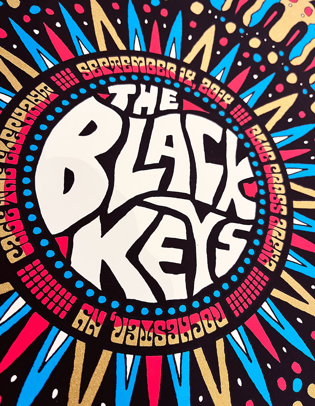 The Black Keys | Concert de Rochester, New York 2014 Sérigraphie Guest: Cage the Elephant | Blue Cross Arena Design de l'artiste Nate Duval Tirage 4 couleurs dont métallique or Edition... Voir la description complète du produit
